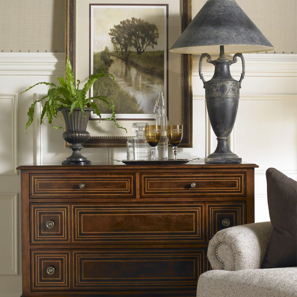 This exquisite four-drawer chest features a beautifully inlaid design, creating a stunning visual appeal. The elaborately veneered drawer fronts, side panels, and top surface are meticulously crafted for a luxurious look. With its graceful tapered legs and intricate detailing, this chest adds timeless elegance to any room.