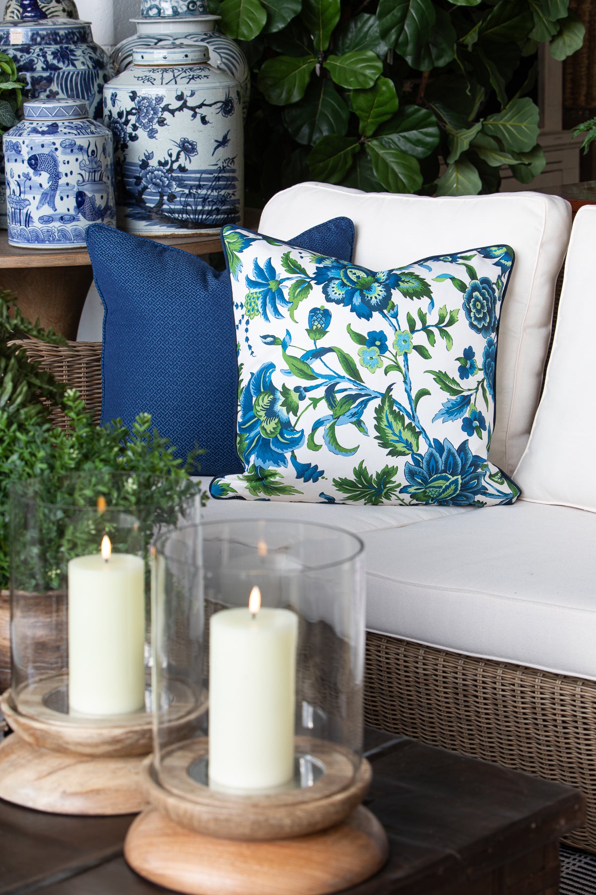 With it's vibrant and striking floral pattern, this cushion is sure to make a statement. It has a mixture of of strong blues and greens sitting on a crisp white background, really making the colours pop. This cushion is outdoor, suitable for your outdoor entertaining area. It looks beautiful paired with any of our blue, navy or green outdoor cushions.