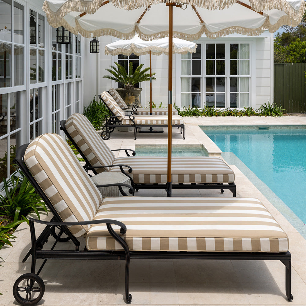 Take a seat and relax by the pool with our custom upholstered Sun lounge.