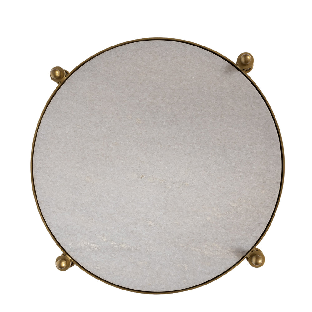 An elegant round iron and marble side table, where sleek modern design meets timeless sophistication. Crafted with precision and care, this exquisite piece seamlessly blends sturdy iron construction with the luxurious beauty of marble.